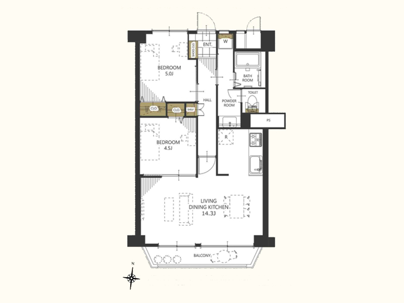 「船橋」駅徒歩7分。南向き5階部分の2LDK。