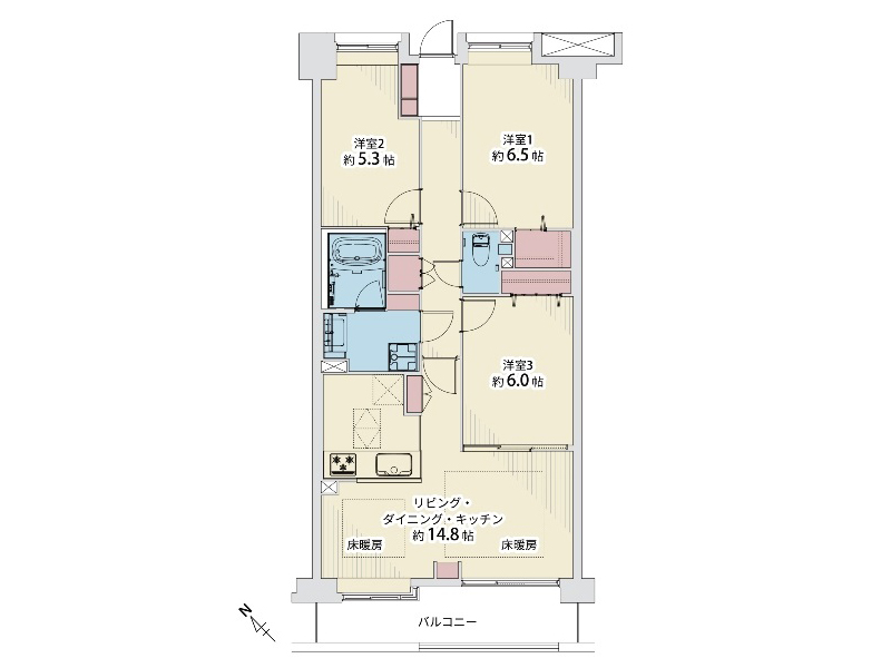 南西向きの3LDK。LDKは14.8帖、各居室も広めで使い勝手はかなり良さそうです。