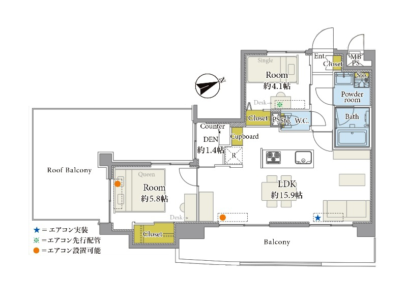 今回紹介しますのは9階部分の東南角部屋。普通、ルーフバルコニーって北側に設置されるものなんですが今回の物件はなぜか南側。お洗濯はもちろん、お子様プールやテーブルを置いてブランチなど。かな~り居心地の良いスペースになること間違いなしですね。