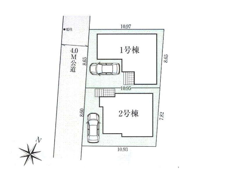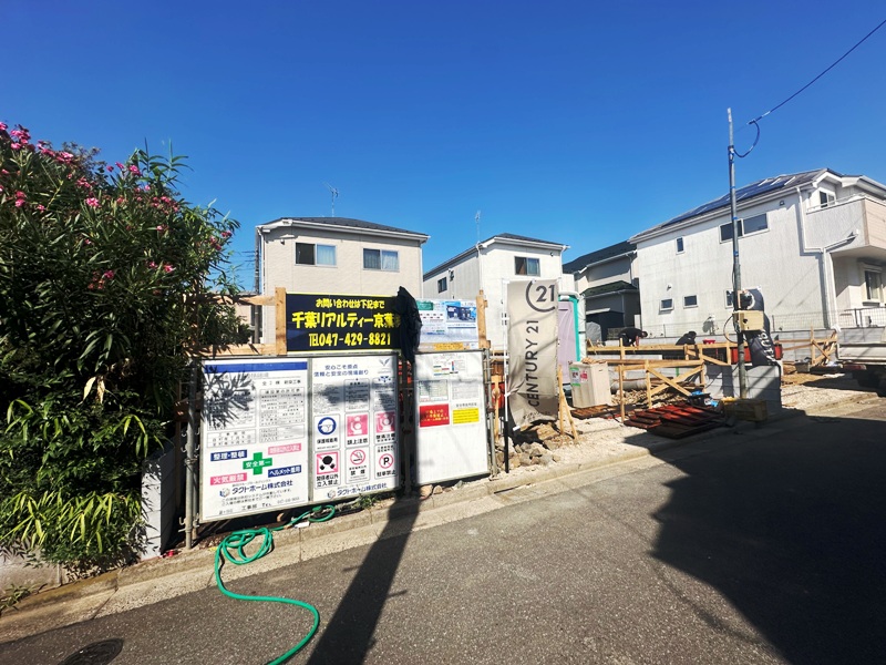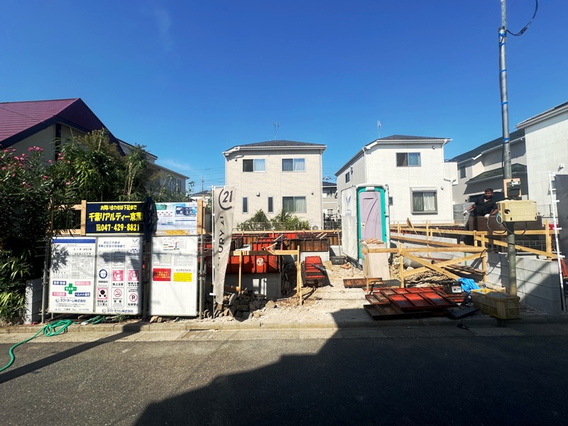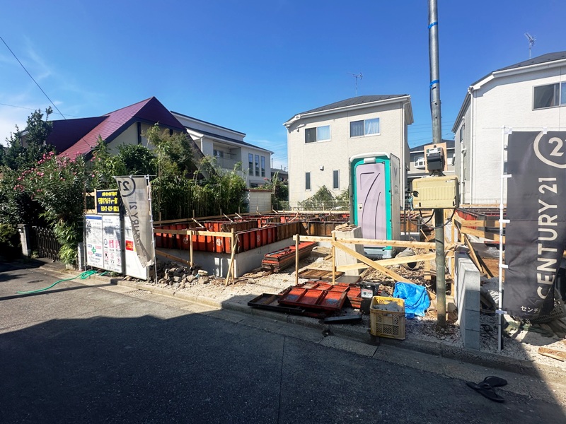 「高根公団」駅徒歩15分。閑静な住宅街に位置します全2棟新築現場。今回は道路から見て左側、1号棟を紹介いたします。