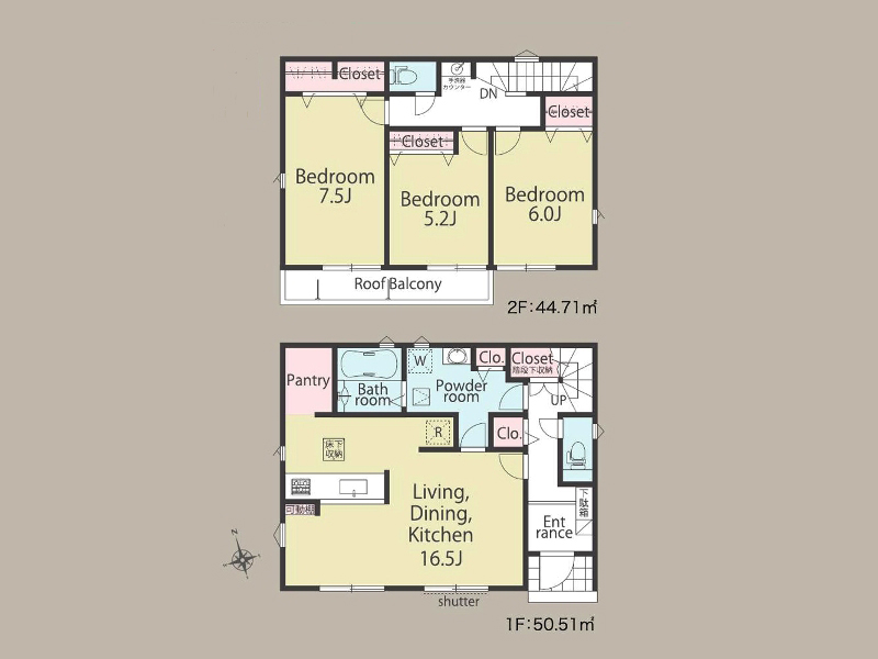 LDK16.5帖の3LDK。キッチン裏手には広めのパントリー。洗面室が広く取られているのも嬉しいポイントです。双方向の動線なのも見逃せませんよね。