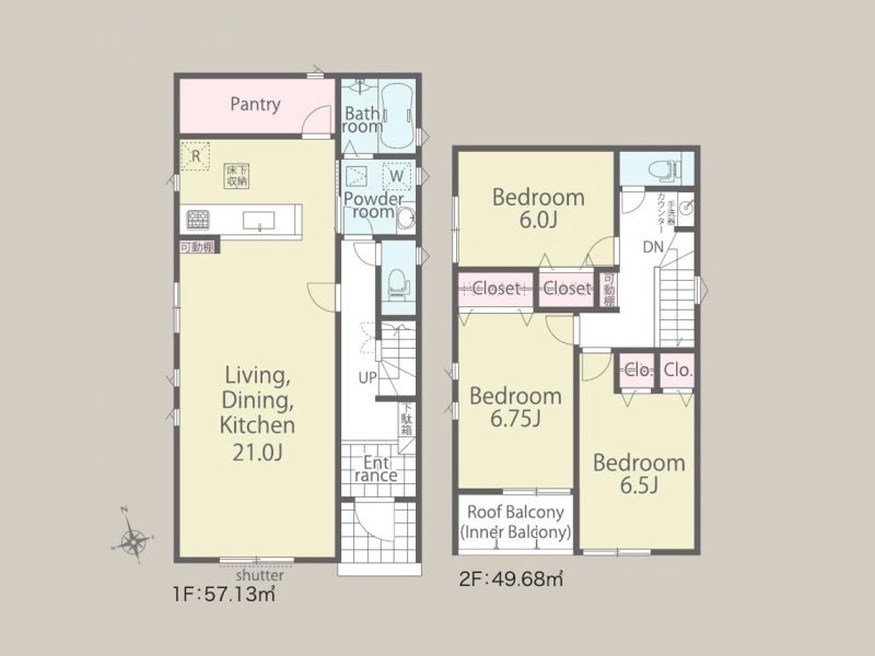 LDKはなんと21帖。キッチン裏手にはパントリーも設置。備蓄用の水や食料、ワインセラー、いきなり大胆にファミリークローゼットなんて使い方も可能ですよね。2階居室もすべて6帖以上。インナーバルコニーも見逃せないポイントですよね。
