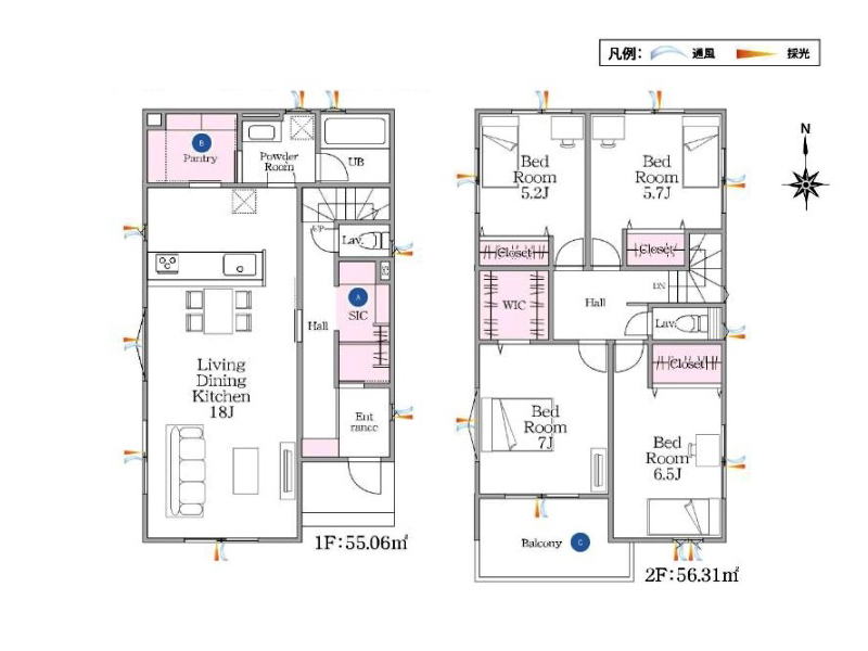 LDK18帖。キッチン裏には広めのパントリーを設置。また玄関横にシューズインクローク。シューズインクロークと記されておりますが、いわばファミリークローゼットですね。双方向動線で使い勝手も良さそうです。2階部分にも収納たっぷり。広めのバルコニーも嬉しいポイントですよね。