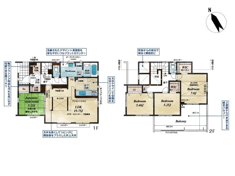 LDK19.75帖の4LDK。縁なしの畳を使用した洋風和室は昨今で言うJapanese Modern的な演出をすればかな~りお洒落な空間になること間違いなしです。また玄関横の土間収納や広~い洗面室など嬉しいポイントが盛りだくさん。