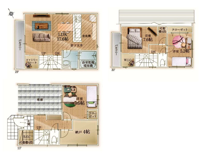 そして1階部分には4帖の納戸とシューズインクローク。収納が多い分、お部屋の床部分は最有効活用が可能。そして食洗機、浴室乾燥暖房機、キッチン上部の折り上げ天井と設備面、お洒落仕様ともにバッチリなんです。