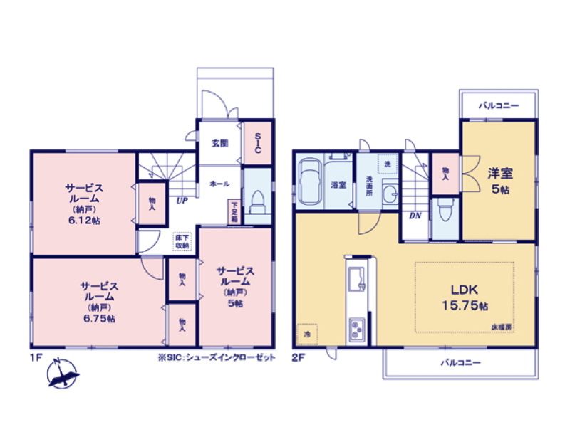 LDK15.75帖の1LDK+3S。間取図にはサービスルーム(納戸)と記載されておりますが、法律的にお隣との間隔、道路からの距離が条件を満たさないと居室と表記出来ないんです。だからって納戸はないよな~と常日頃思うわけなんですが。納戸の中にさらに物入があるって変ですよね。