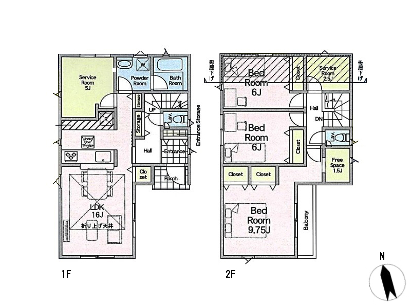 LDK16帖。キッチン後ろのサービスルームはパントリーとして大活躍間違いなし。2階の3つの居室はすべて6帖以上。主寝室には1.5帖のフリースペース、ホール部分には2.5帖のサービスルームと収納たっぷりで使い勝手の良さそうな間取りとなっております。