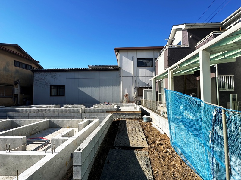 「船橋」駅徒歩26分。全4棟新築現場より1号棟を紹介いたします。現地はこんな状態(まだ基礎部分のみ)なのに既に2棟がご成約済。人気の程がうかがえますでしょ。