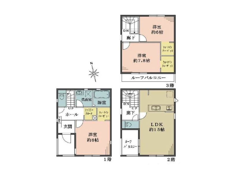 物件の方ですがLDK15帖の3LDK。ポイントは各居室の広さです。加えて各居室にウォークインクローゼットを完備。室内に収納家具を置かなくて良いので一層お部屋を広く使えますね。またLDKに隣接するルーフバルコニーはサブリビング的に使用できそうな広さにレイアウトとなっております。