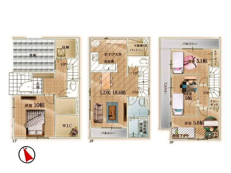 LDK18.4帖の4LDK。昨今人気?のL字型キッチン。その横にはパントリー。生活動線的にはかなり有利な気がします。1階主寝室にはやたら広そうな収納スペース。3階のバルコニーは全室にまたがっていて使い勝手も良さそう。と見どころ満載ですね。