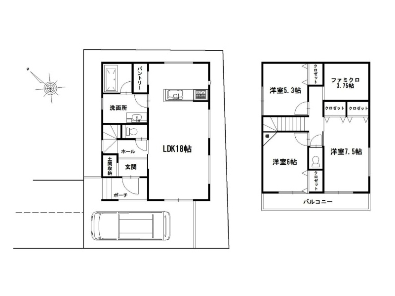 LDK18帖の3LDK。キッチン横にはパントリー。ゆったりした広さの洗面室、玄関横には土間収納と最近のニーズをしっかり押さえております。2階に目を向けますと何と言っても3.75帖のファミリークローゼットが使い勝手良さそう。これも最近のトレンドですね。