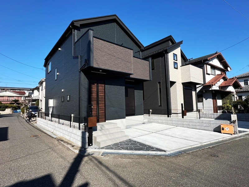 今回紹介しますのは全2棟新築現場。角地側に立地、陽当り、開放感申し分なしの1号棟です。