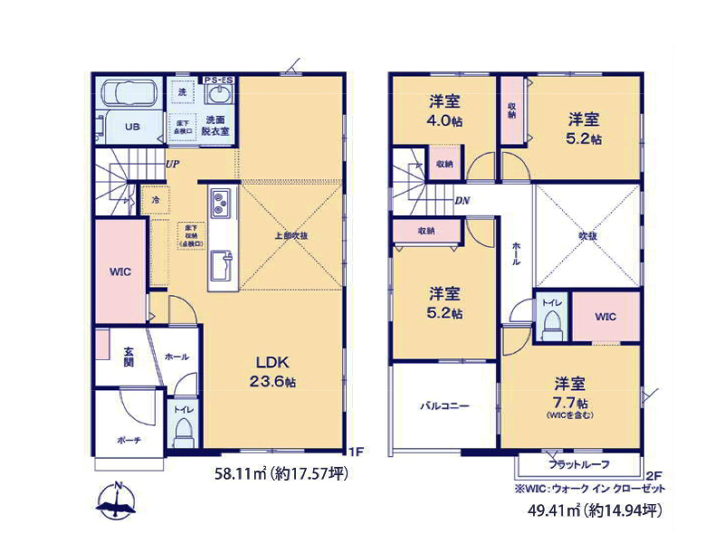 土地面積71.00坪。竿の部分を利用してカースペースは2台分を確保です。LDKはゆったり過ぎる23.6帖。私的におすすめしたいのは広いお庭を利用してリビングに隣接するウッドデッキ。若しくは昨今流行りのコンテナ風離れなんてのもおススメです。LDK上部には大きな吹抜け。まさにリゾート感溢れる... といった感じではありませんか?
