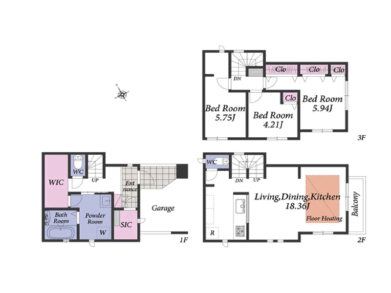 LDK18.36帖の3LDK。南側は隣地通路ですので陽当りも良好です。1階部分にはウォークインクローゼットにシューズインクロークと収納スペースもっぷりですよ。