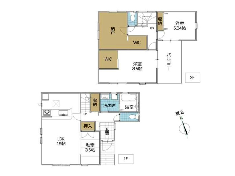 LDK15帖に3.5帖の和室が隣接。この和室、お父さんのごろ寝スペース、お子さんたちの遊び場、冬のお炬燵スペース&鍋などなど。ジャストな広さではありませんか? 2階主寝室は8.5帖、ウォークインクローゼット付きです。北側の納戸(サービスルーム)にもウォークインクローゼット。収納スペースたっぷりで使い勝手も良さそうです。
